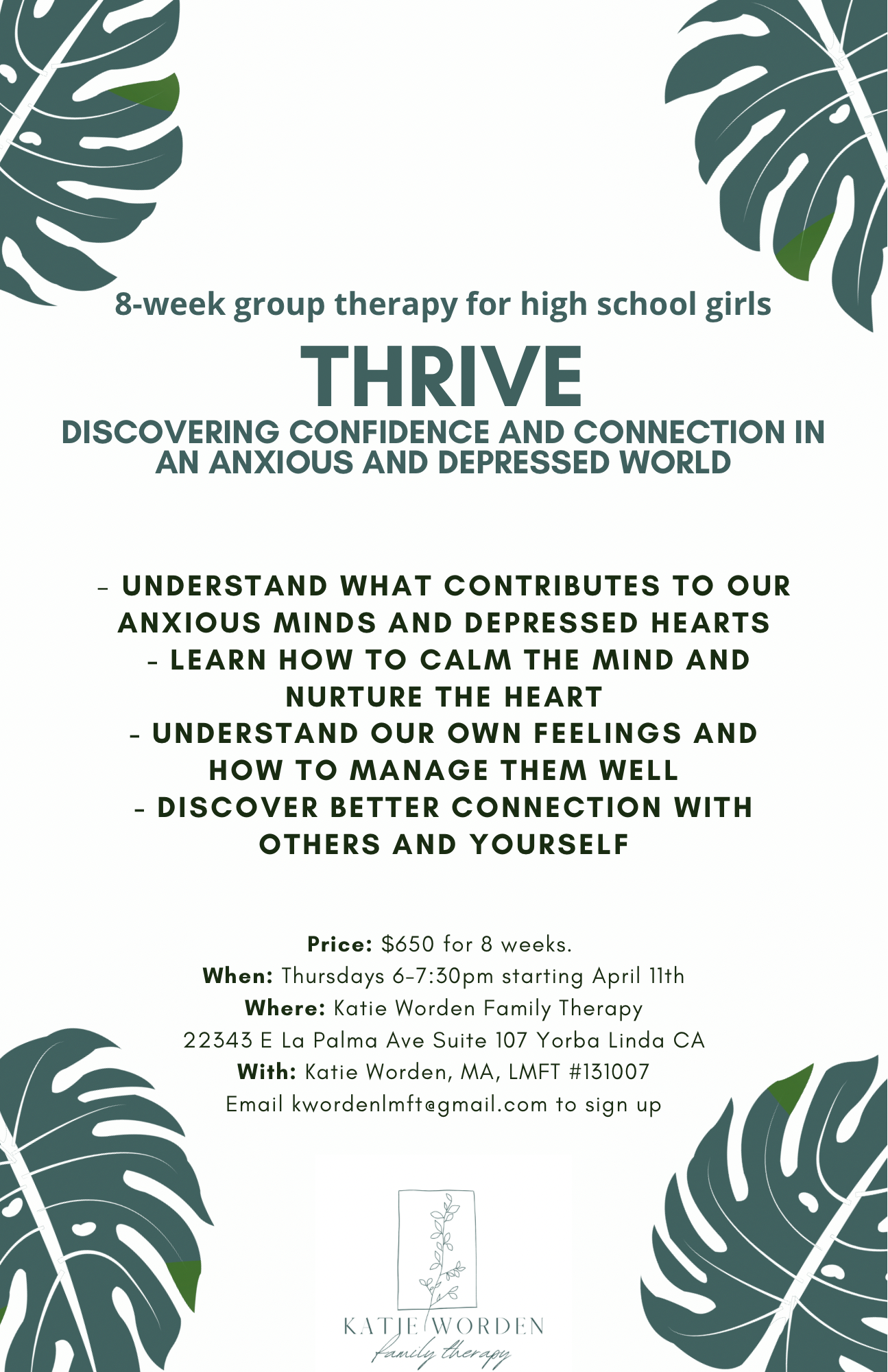 The current group I am offering is specifically for high school aged girls who are experiences anxiety or depression and are looking to increase their coping skills.